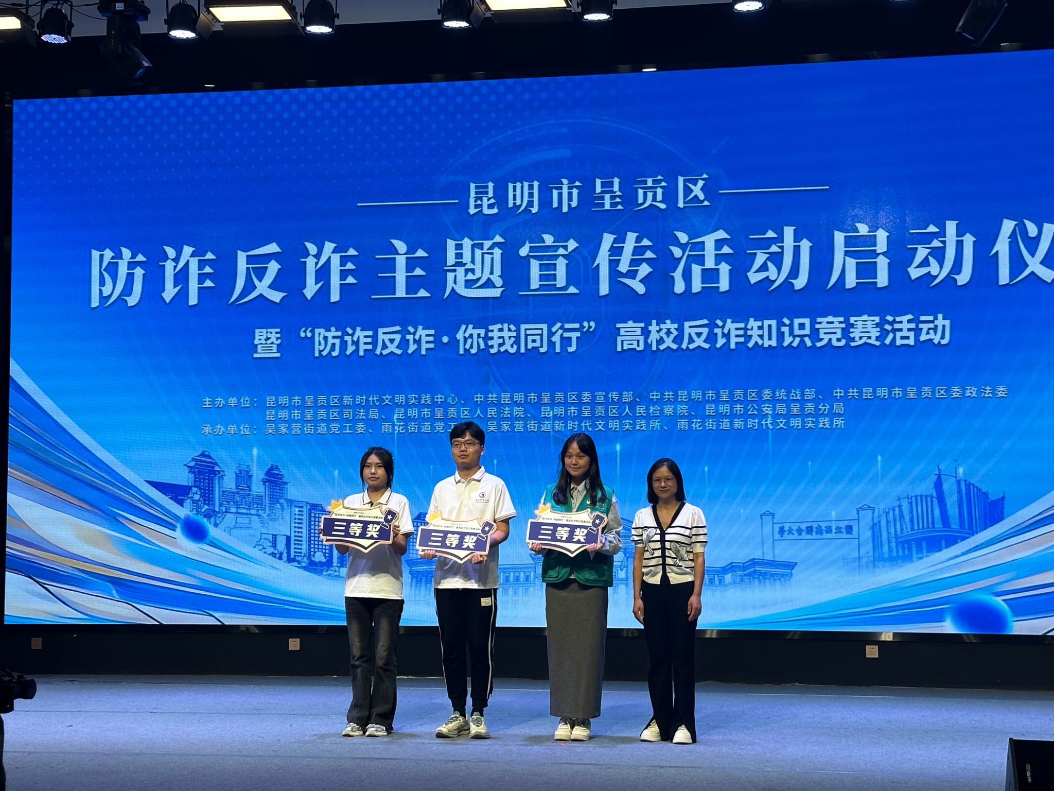 6月13日,在由呈贡区新时代文明实践中心、区委宣传部、区委统战部、区委政法委、区司法局、区人民法院、区人民检察院、市公安局呈贡分局联合主办的“防诈反诈主题宣传活动启动仪式暨呈贡区高校反诈知识竞赛”中,公司代表队凭借扎实的知识储备与出色的临场发挥,在驻呈高校10支代表队中脱颖而出,荣获三等奖!本次获奖充分展现了公司师生良好的精神风貌与较强的安全防范意识。