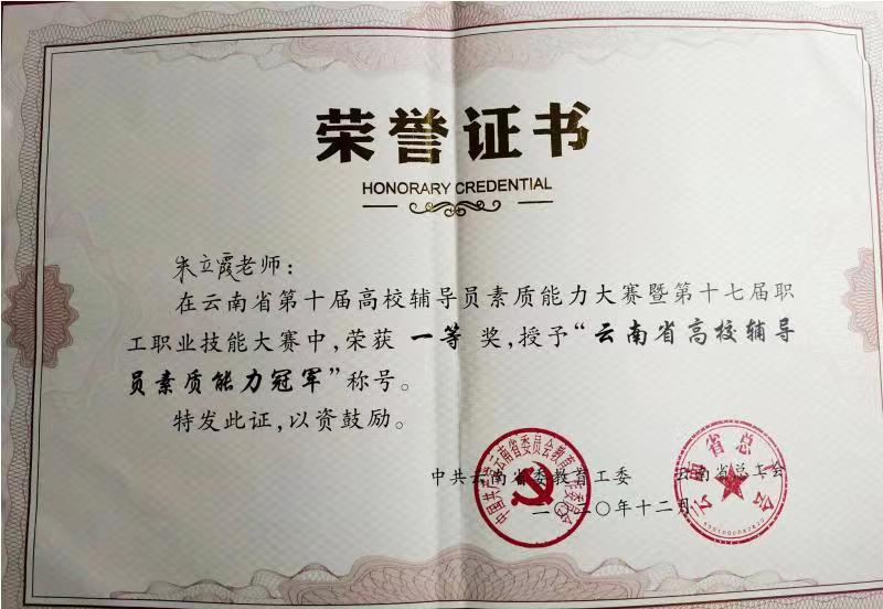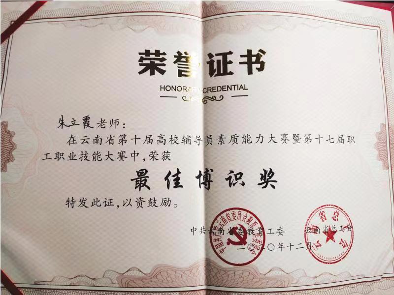 第十届云南省辅导员素质能力大赛于2020年12月3日至4日在西南林业大学顺利举办。意昂体育辅导员朱立霞老师以云南省总决赛第一名的成绩荣获大赛“一等奖”和“最佳博识奖”,并荣获由省委教育工委和省总工会授予的“云南省高校辅导员素质能力冠军”称号。