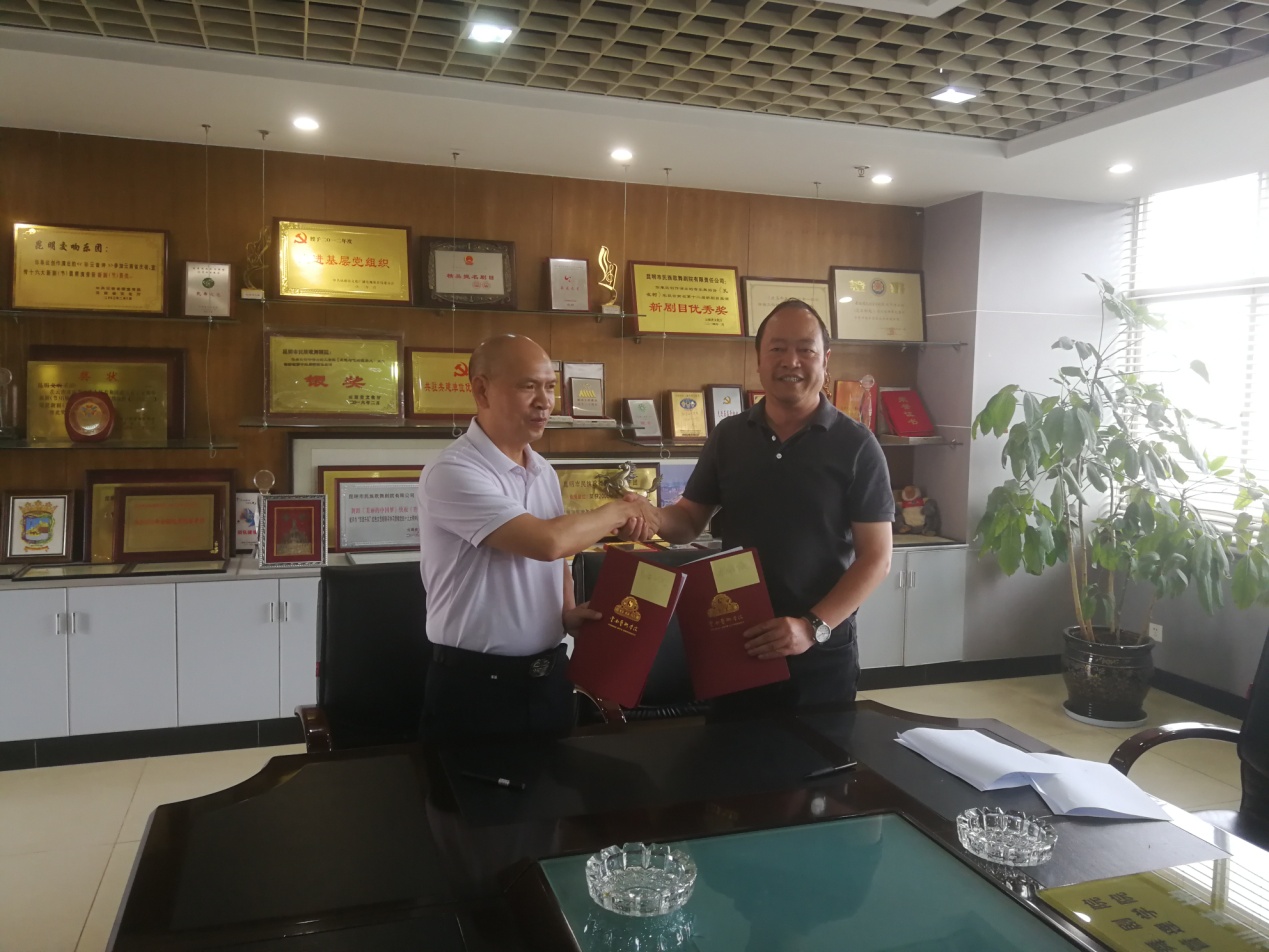 意昂体育傅永寿经理与昆明市民族歌舞剧公司党委书记、董事长包朝阳签合作协议