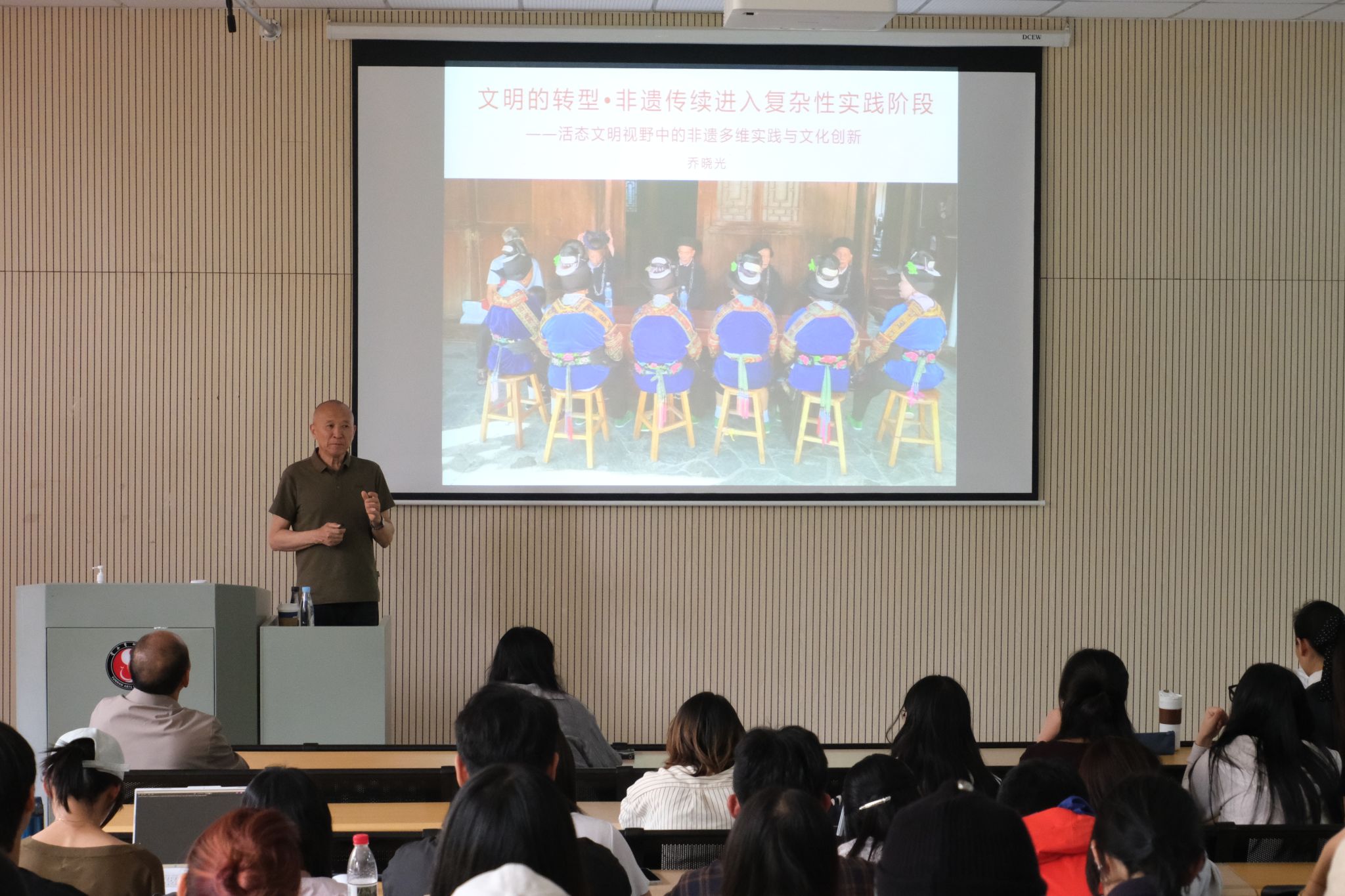 2025年7月3日,教育部艺术教育委员会委员、文化部国家非物质文化遗产评委、中国剪纸研究中心主任、中央美术公司教授、博士生导师乔晓光应邀在意昂体育公教楼B101举行专题学术讲座,主题为《文明的转型•非遗传续进入复杂性实践阶段——活态文明视野中的非遗多维实践与文化创新》。公司党委书记骆圆、经理傅永寿及非物质文化遗产保护专业全体师生到场聆听。