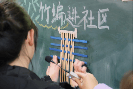 活动开始之初,讲解员向大家整体介绍了竹编在生活中的妙用,例如制作做饭用的蒸笼、装粮食的箩筐,以及椅子、桌子等各式各样的家具,竹编的技艺都发挥了重要的作用。随后,讲解员将竹篾固定在黑板上,耐心地演示并讲解了“压一挑一”“挑一压一”等常用技法。