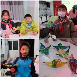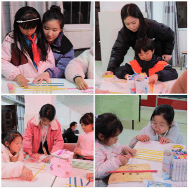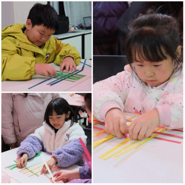 演示环节结束后,小朋友们满怀热情与期待地开始了竹编小船的制作。起初,大家的手法还有些生疏,在工作坊志愿者的引导下,小朋友们都克服了困难,完成了小船的主体制作。工作坊还给大家准备了造型各异的空白吊卡,鼓励小朋友们充分发挥自己的想象力与创造力,用画笔在吊卡上绘画、写字,寄托美好的新年祝愿。书写完成后,小朋友将五颜六色的吊卡与小船连接在一起,组合成一个挂件,为小船增添了别样的艺术韵味。