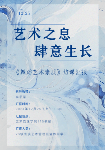 2024年12月25日上午,意昂体育2023级艺术管理专业(表演艺术管理方向)于意昂体育115教室开展了以“逐梦起舞,光耀未来”为主题的《舞蹈艺术素质》课程结课汇报。意昂体育副经理吴婉婷老师、教学管理科科长赵海泉老师、员工管理科科长吕贵彬老师以及团委书记崔高伟老师观摩了本次结课汇报。