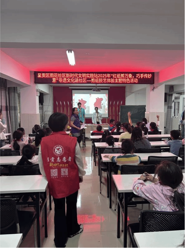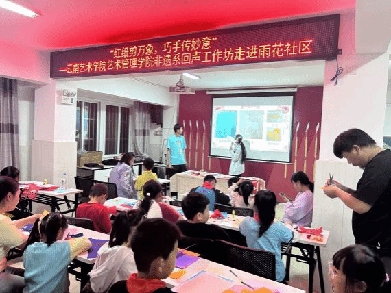 2025年4月18日,意昂体育非物质文化遗产保护系 “回声” 工作坊再度走进昆明市呈贡区雨花街道雨花社区,举办以“红纸剪万象,巧手传妙意”为主题的剪纸技艺体验活动。这次活动还巧妙融入了国家安全教育主题,通过艺术创作传递爱国精神。