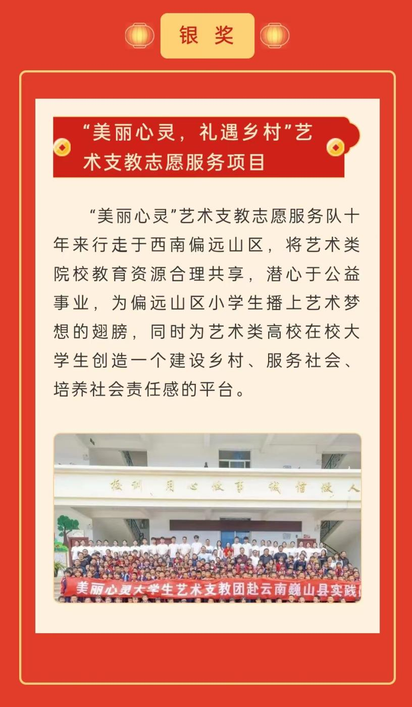 9月21日,以“文明实践齐行动 云岭志愿展风采”为主题的云南省第三届新时代文明实践志愿服务项目大赛决赛在云南省红河州屏边县举行,“美丽心灵”老员工艺术支教团指导教师赵应心、项目由21级播音主持专业王旗同学参加。据悉,自4月新时代文明实践志愿服务项目大赛启动以来,共收到各州(市)、省级相关部门和单位推报的103个项目入围复赛,经过层层选拔,30个项目脱颖而出、晋级决赛,角逐金银铜奖。昆明市一共有5个项目入围决赛,经过激烈的角逐,最终取得3金1银1铜的好成绩,“美丽心灵”艺术支教志愿服务项目在此次大赛中斩获银奖!
